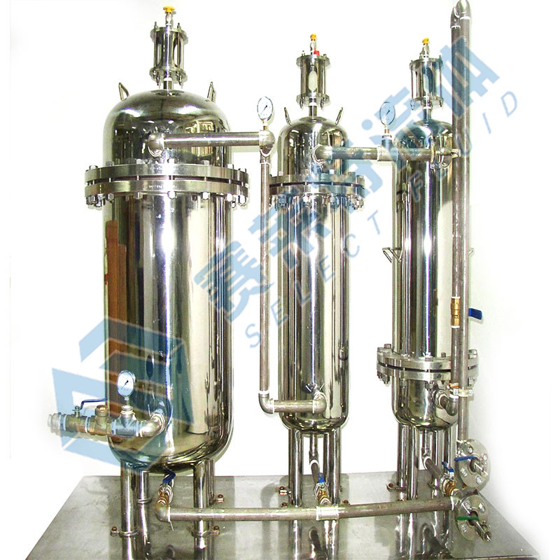 油水分离器由筒式过滤器串联而成,内分别装亲水性滤芯、吸油性滤芯。需清洗液体分离器底部 泵入第一台过滤器内,由于滤芯的亲水性作用,使杂质和悬浮油液富集到顶端,受压后排出机外;滤清液则进入第二台过滤器,经吸油性滤芯过滤后,精度在10微米以下。